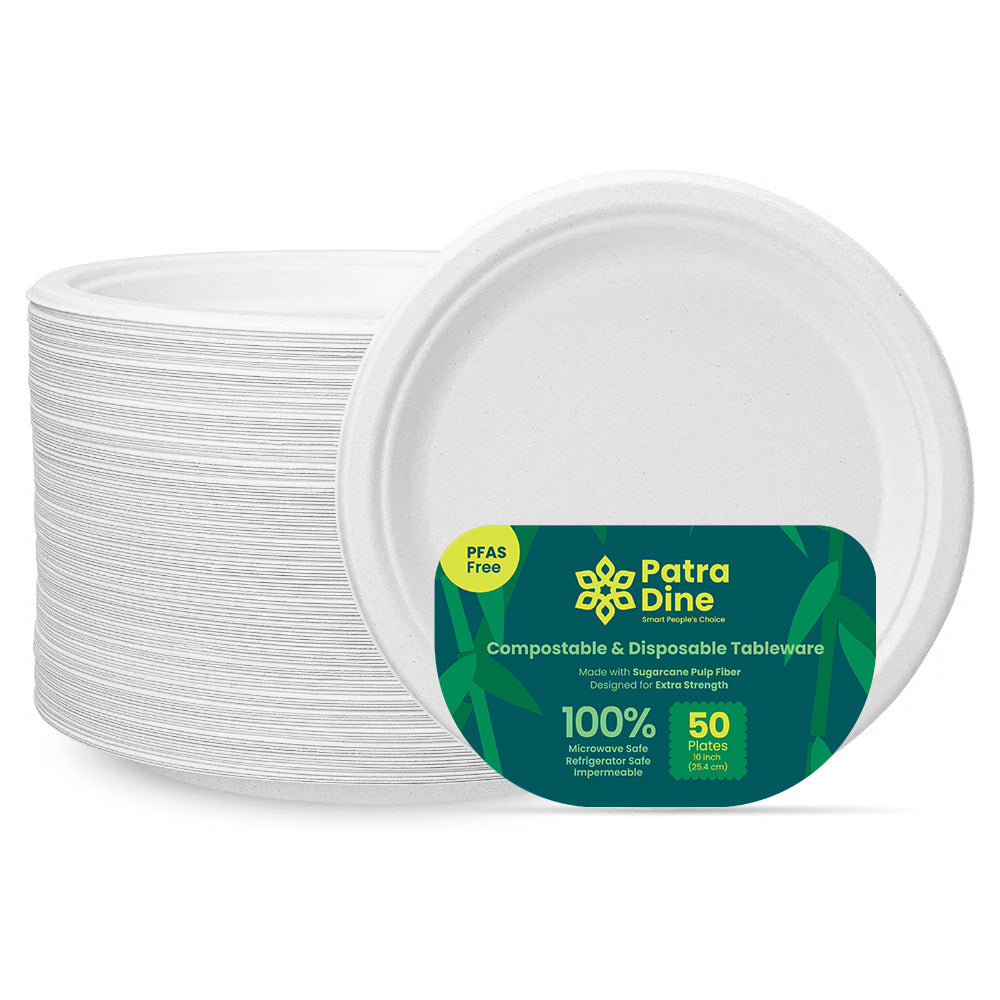 PatraDine 50 Counts / 500 Counts | Disposable Bagasse Paper Plates | 10"Plain Plates | 90 days Compostable Eco-Friendly | Bagasse School Lunch Trays | Heavy-Duty Sugarcane Plates | Microwave Safe | From India | Vegan | Organic | PFAS Free